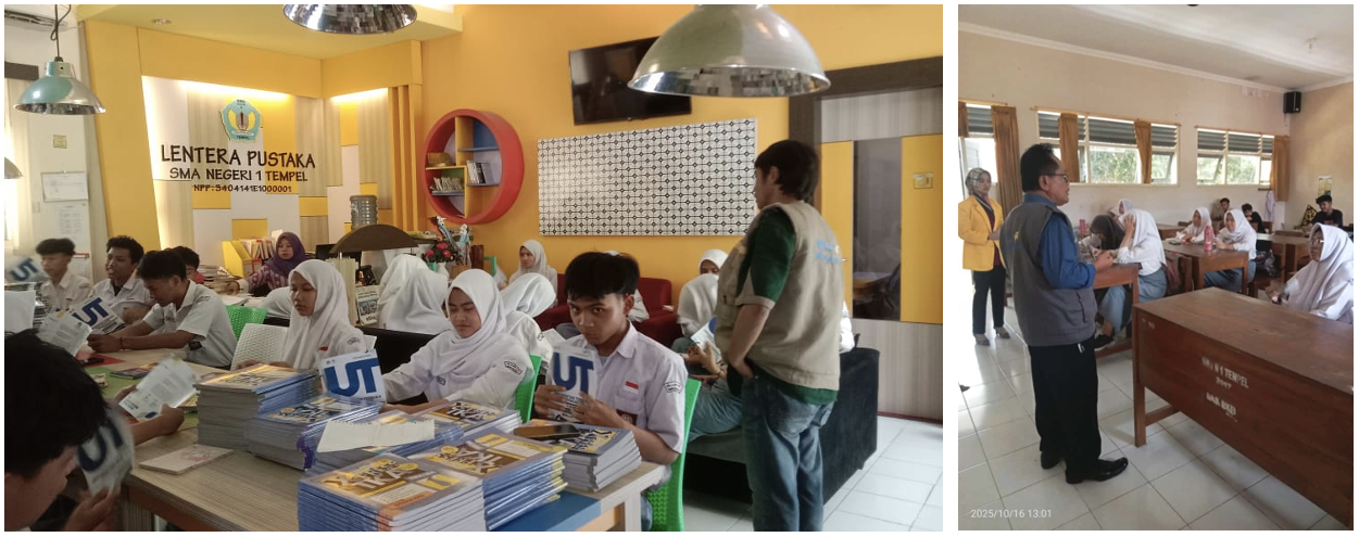 Sleman, 16 Oktober 2025 – Universitas Terbuka (UT) Yogyakarta bersama Sentra Layanan UT (SALUT) Merapi Srumbung kembali melanjutkan misi edukatifnya dengan menggelar kegiatan sosialisasi di SMAN 1 Tempel, Sleman. Kegiatan ini dilaksanakan pada Kamis, 16 Oktober 2025, dan disesuaikan dengan jadwal Bimbingan Konseling (BK) sekolah. Sebanyak 139 siswa dari jurusan IPA dan IPS mengikuti kegiatan ini dengan antusias. Sosialisasi dipandu oleh Drs. Mujiman, M.Pd., selaku Ketua SALUT Merapi Srumbung, yang memperkenalkan Universitas Terbuka sebagai Perguruan Tinggi Negeri (PTN) yang menyelenggarakan pendidikan tinggi terbuka dan jarak jauh.